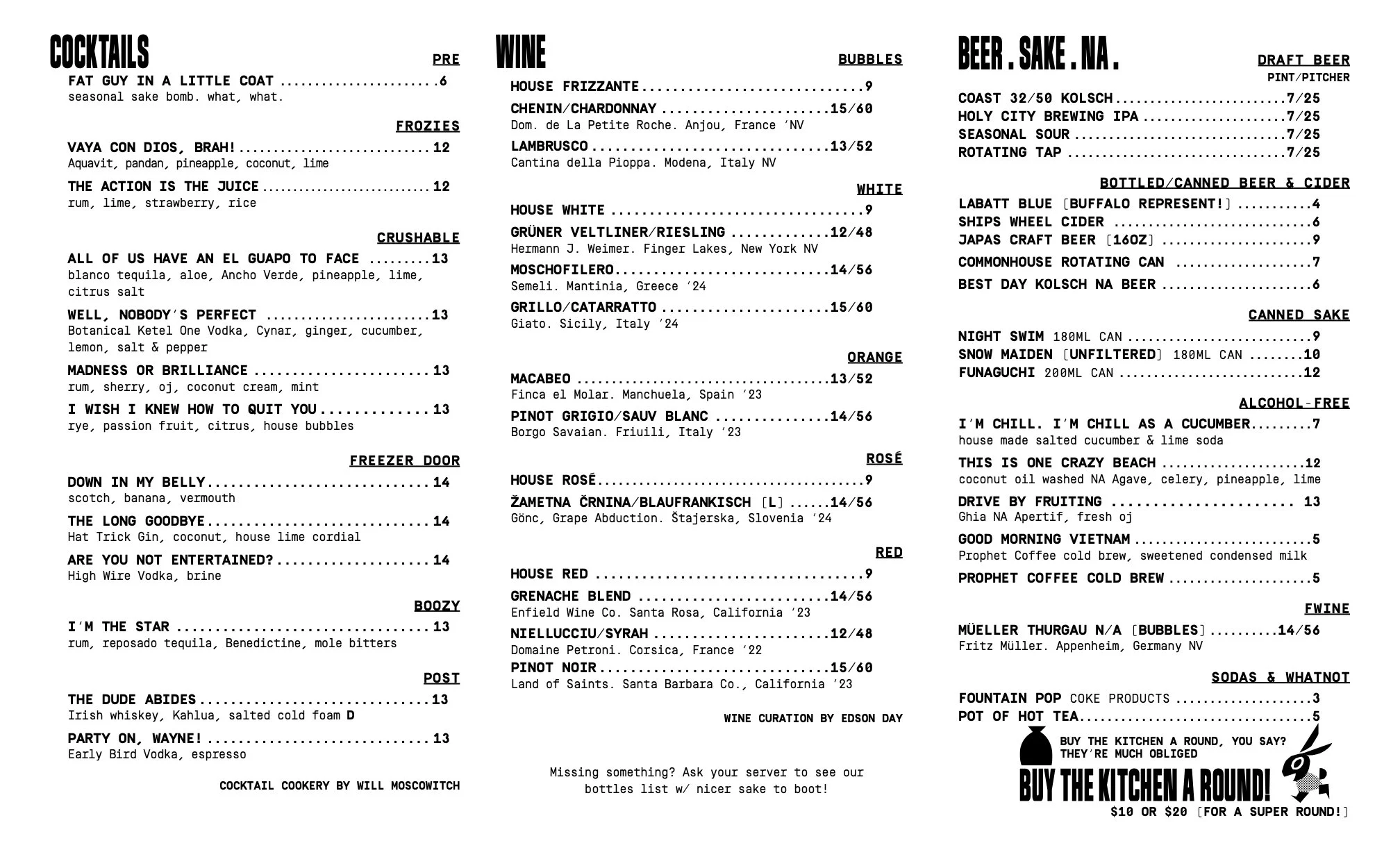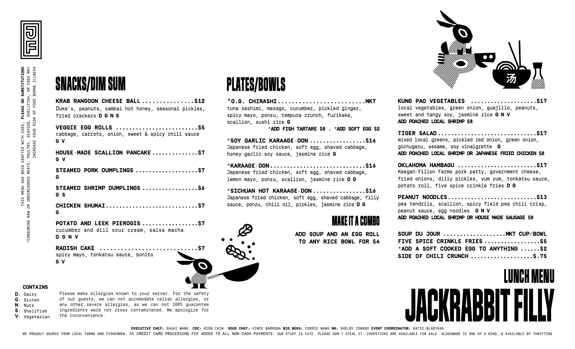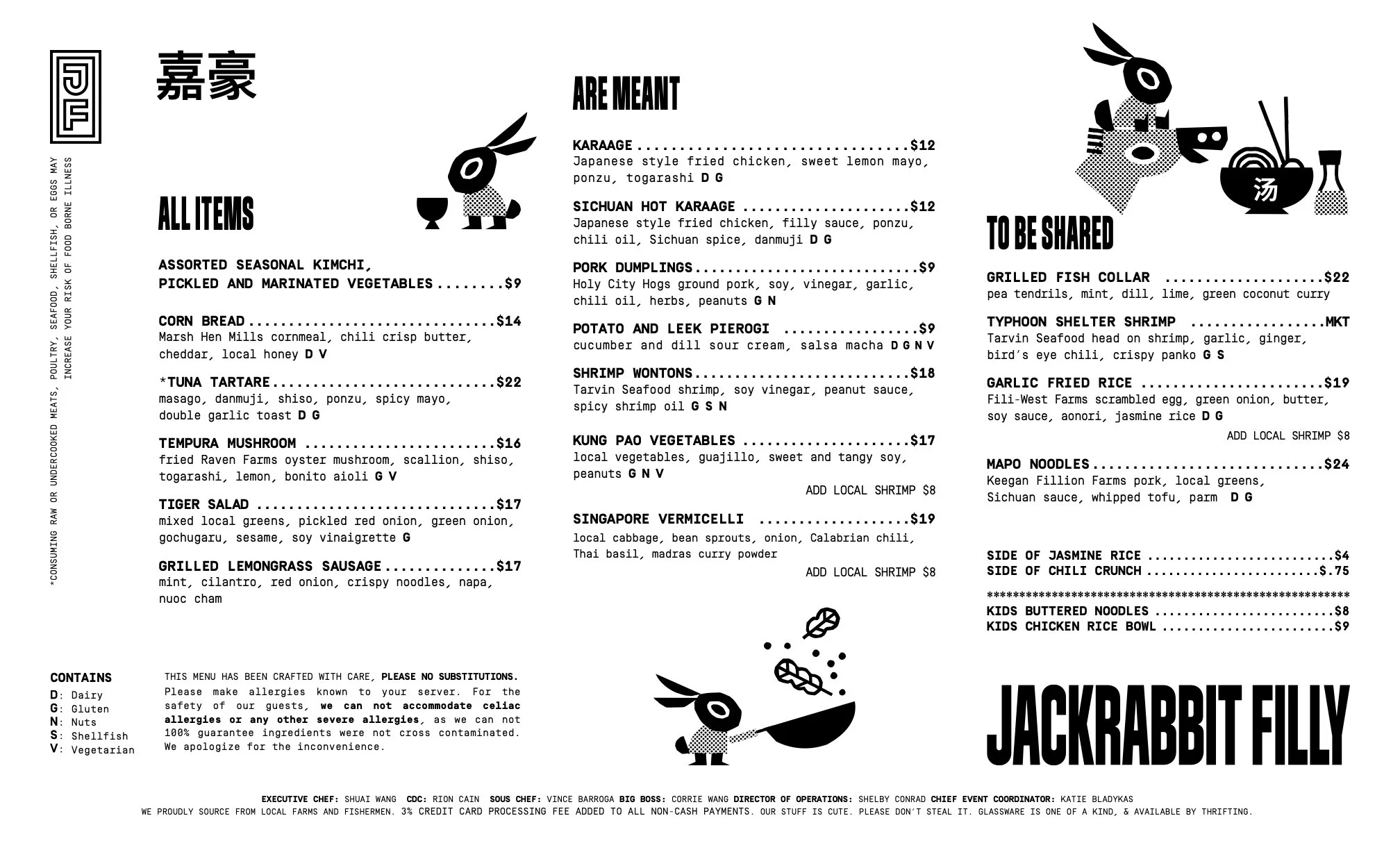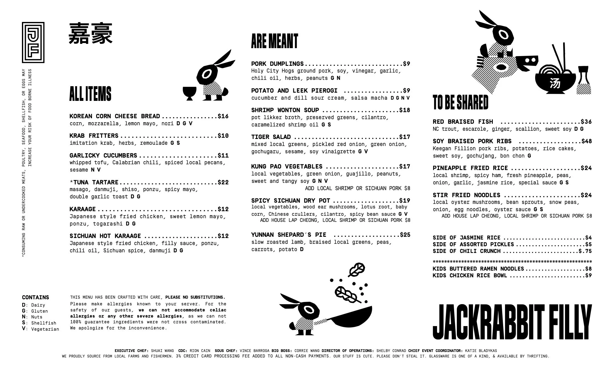 All menues are seasonal and subject to change. At this time, we can no longer accomodate severe allergies. The potential cross contamination during prep makes it impossible.